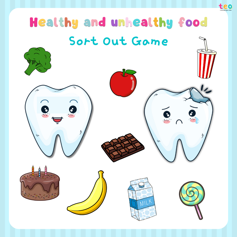 A simple and fun game to practise food vocabulary while learning about healthy eating and dental hygiene.
