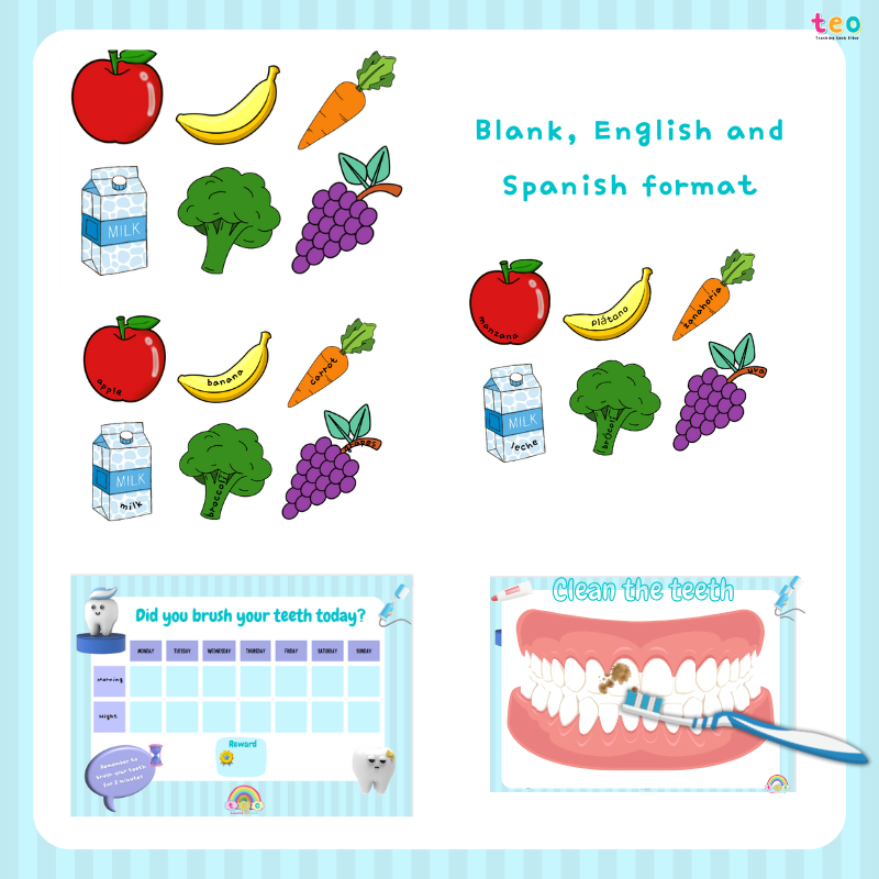 Un juego sencillo y visual para practicar el vocabulario de los alimentos mientras reflexionamos sobre la importancia de una dieta equilibrada y la higiene dental.